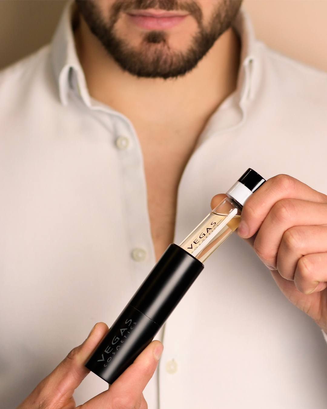2. Placez la recharge avec la tête de pulvérisation fixée à l'intérieur du Parfum Case.